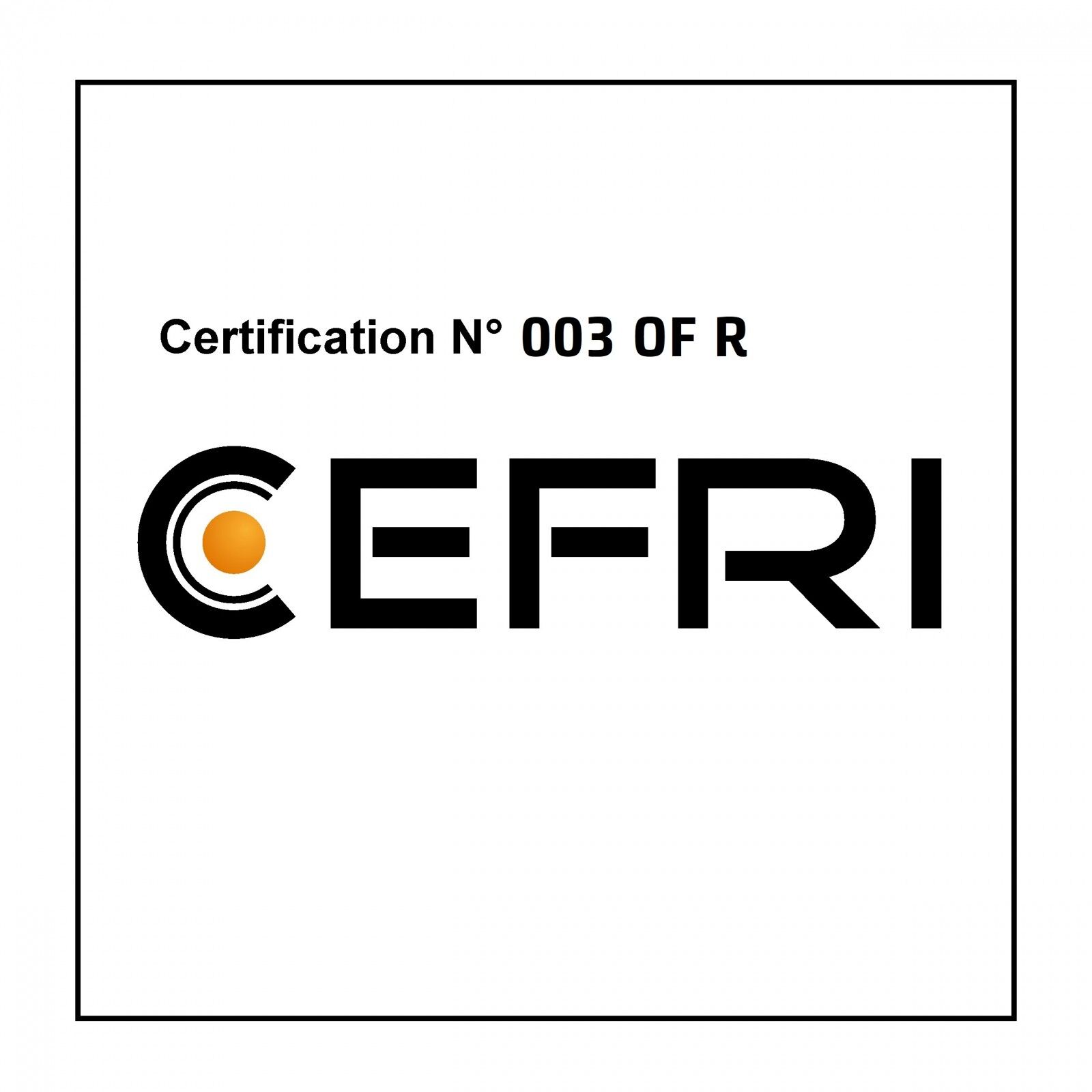 Certification selon CEFRI / SPE-R-0414 et arrêté du 06 Décembre 2013.Certificat n° 003 OF R : Organisme de Formation de la Personne Compétente en Radioprotection Niveau 1 et 2 Domaines "Médical" et "Industrie"